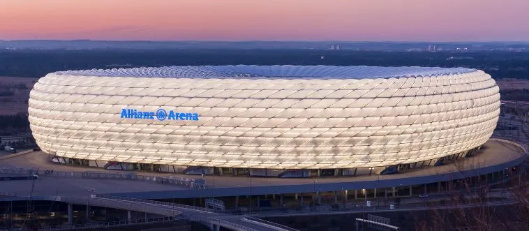 Which Bundesliga club plays at Allianz Arena, famous for its glowing exterior?